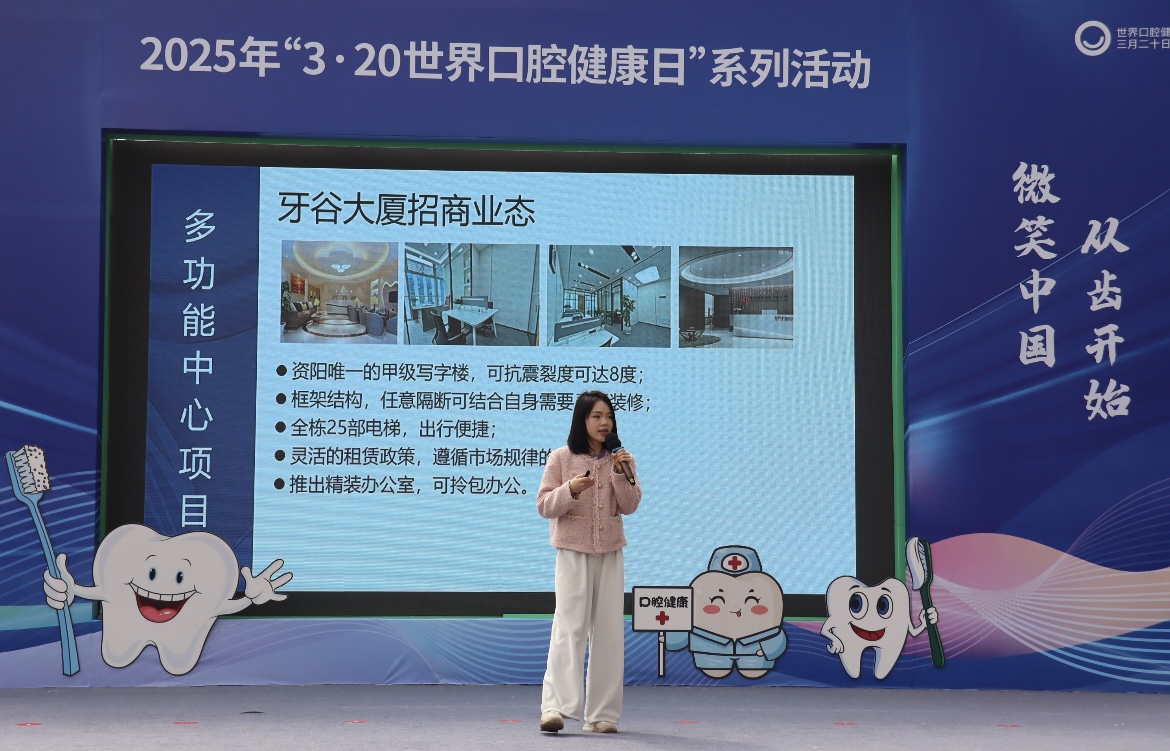 在“3.20世界口腔健康日”到来之际,公司联合资阳市总工会、高新区总工会、资阳市科学技术协会、资阳市口腔医疗产业协会、资阳高新口腔医院有限公司共同在资阳万达广场举办“口腔健康、身心健康”世界口腔健康日活动。资阳高新区党工委委员、管委会副主任、园区总工会主席刘莉出席启动仪式并讲话。市总工会、市科协相关领导及四川惠民口腔健康推广中心代表、四川大学华西口腔医院主任医师、教授陈亚多等参加启动仪式。