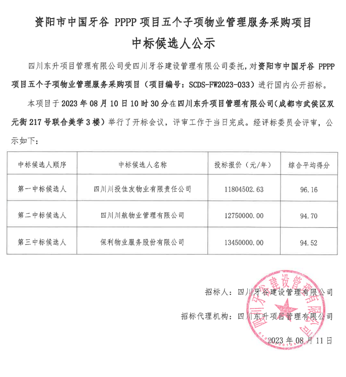 资阳市中国牙谷PPP项目五个子项物业管理服务采购项目中标候选人公示