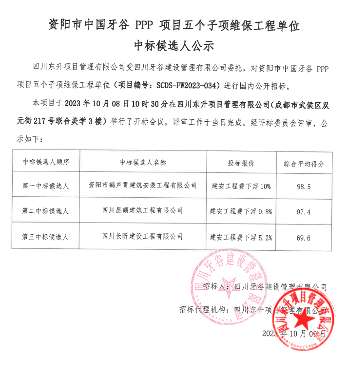 资阳市中国牙谷PPP项目五个子项维保工程单位中标候选人公示